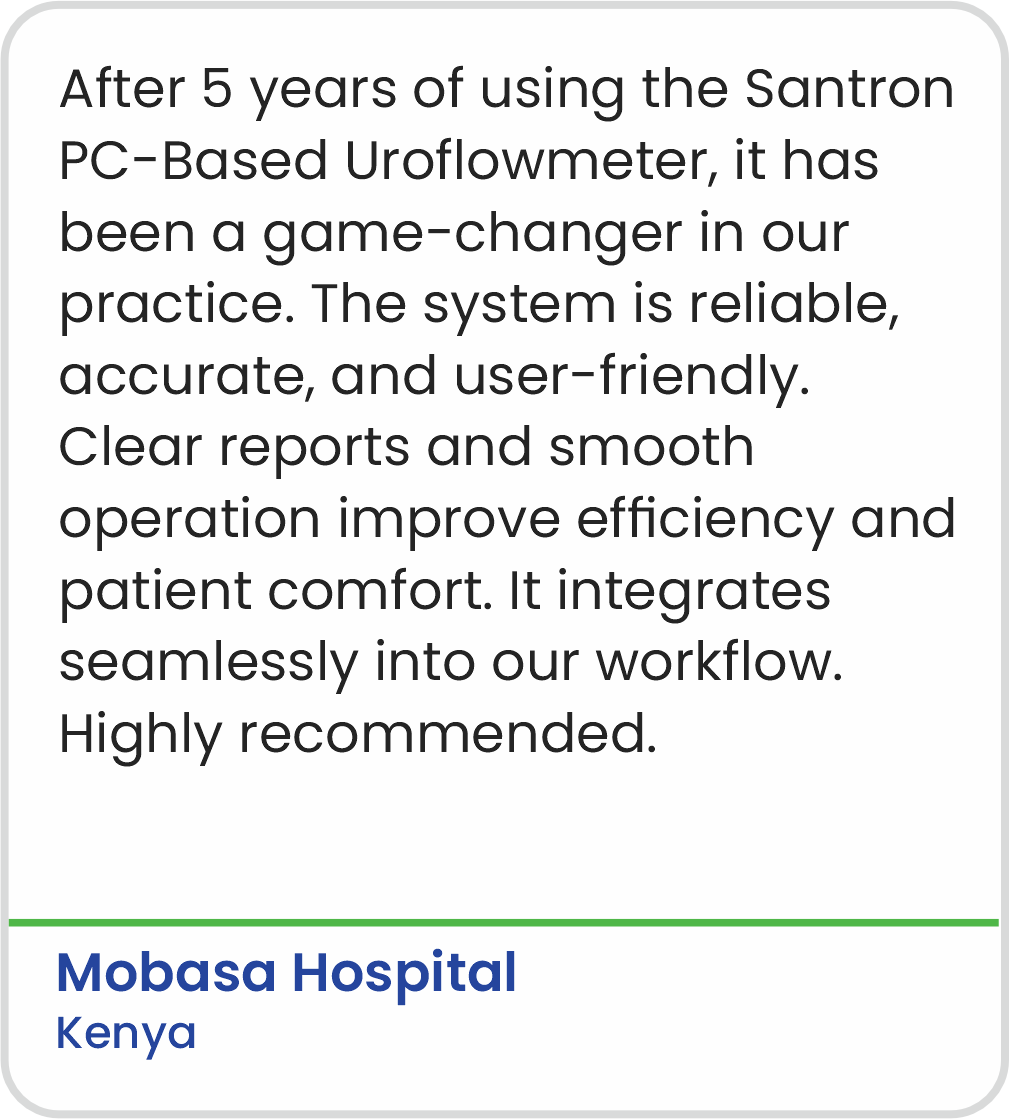 “Santron Meditronic Urodynamic Equipment manufactured in Pune, India, is sturdy, reliable, and simple to use. It’s very cost-effective and utilizes very little space.”